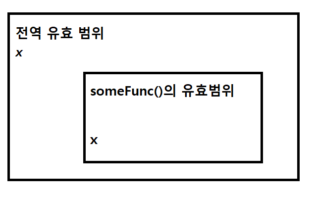 컴파일러는 자신이 처리하고 있는 지역 유효 범위(local scope)를 뒤져서 같은 이름을 가진 것이 있는지 알아본다. 그리고 찾았다면 이외의 유효 범위에 대해서는 더 이상 탐색하지 않는다. 그리고 지역 유효 범위 안에 찾는 이름이 없다면 전역 유효 범위(global scope) 안에서 같은 이름을 가진 것을 찾는다.