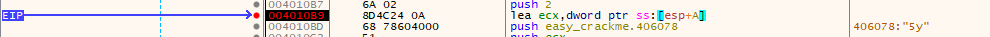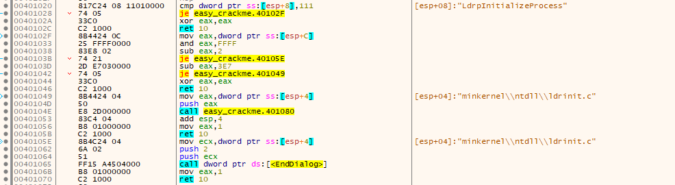 처음 attach를 시키면 상단바에 모듈이 ntdll.dll로 되어있는데, easy_crackme.exe로 변경한다. (보기-Modules)
