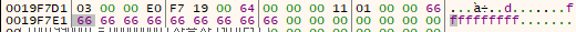 text 검증하는 듯한 쪽에 break 포인트를 걸고, 임시로 fffffffff를 입력 후 아래처럼 문자가 들어간 곳의 메모리(덤프)를 확인하면
