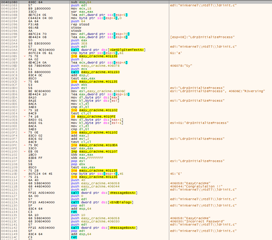 0x00401020에는 패스워드 인증 루틴이 없지만, 함수를 호출하는 것을 확인할 수 있는데 이를 따라가 보면,