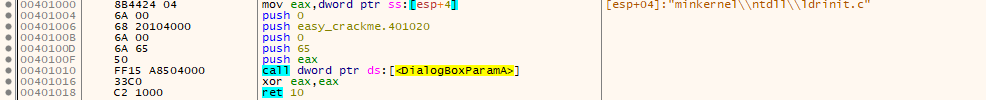 즉, 4번째 인자의 값에 대화 상자 프로시저에 대한 포인터가 있음을 알기 때문에 0x00401020를 먼저 확인해 보자.