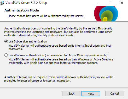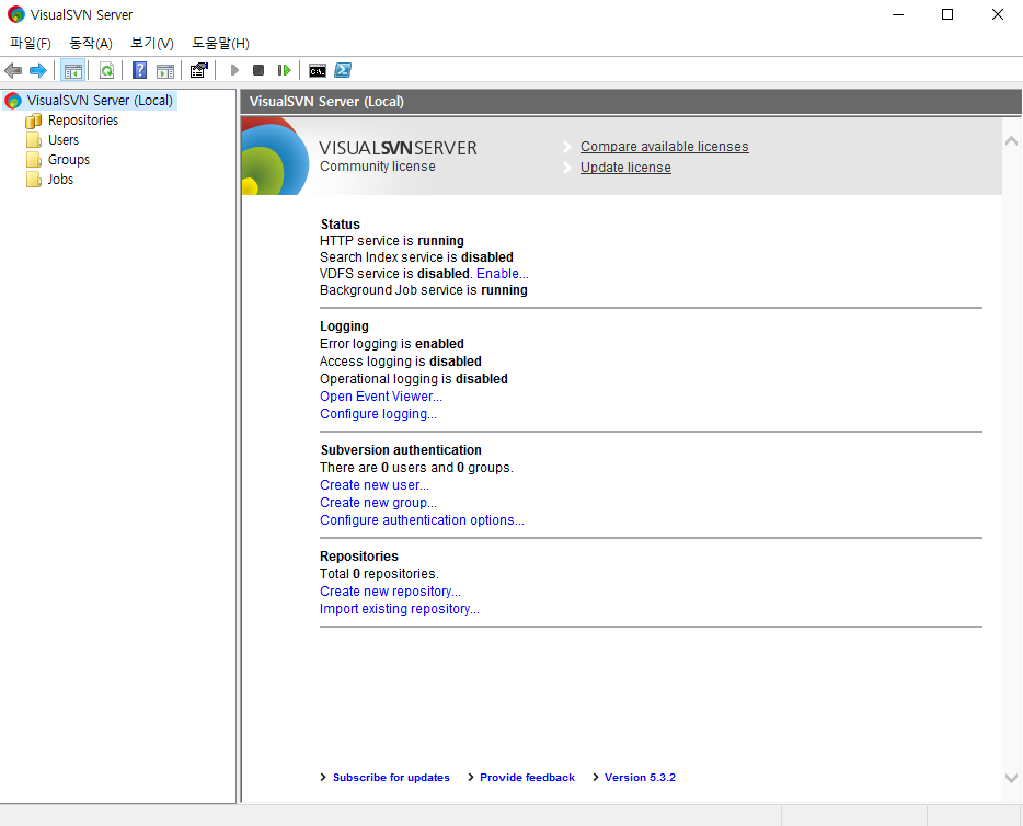 이 글에서 VisualSVN Server의 Version은 5.3.2를 사용하며, 64bit로 설치하였다.