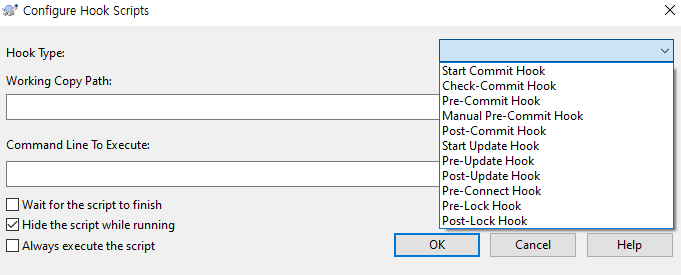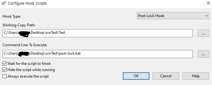 HookType은 원하는 이벤트 시간에 맞게 설정하면 되며, Working Copy Path는 현재 작업 중인 SVN 저장소 디렉터리로 지정하고 Command Line To Execute는 실행시킬 hook script 실행 커맨드를 지정하면 된다.