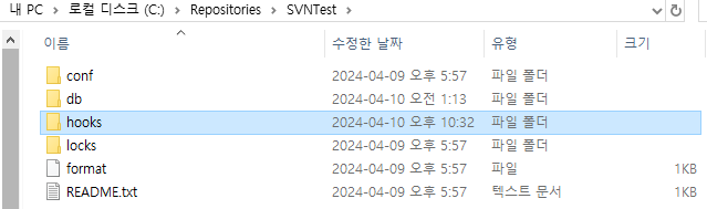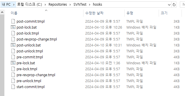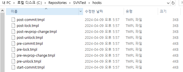 훅 프로그램은 저장소의 hooks 디렉터리에 위치한다. 기본적으로 SVN 저장소를 생성하면 훅 스크립트 폴더가 생성되며, 그 아래 스크립트 템플릿이 같이 생성된다.