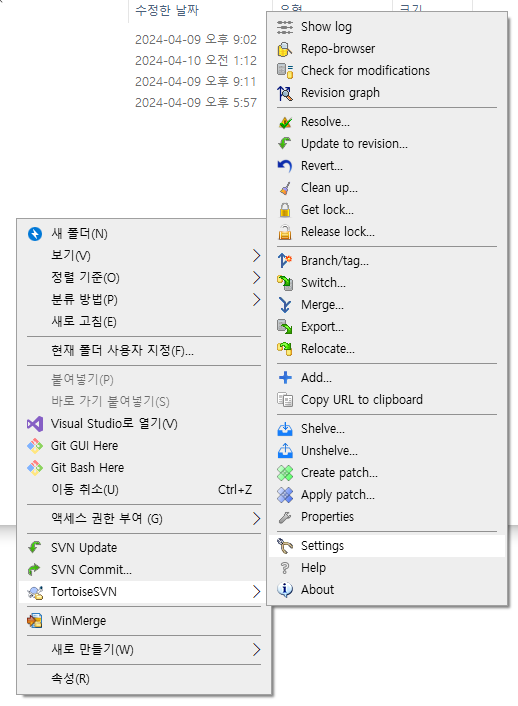 TortoiseSVN가 설치되어 있다면 로컬에서 내려받은 저장소 폴더에 가서 우클릭을 했을 때 아래와 같은 메뉴가 나오는데, 여기서 Settings을 선택한다.