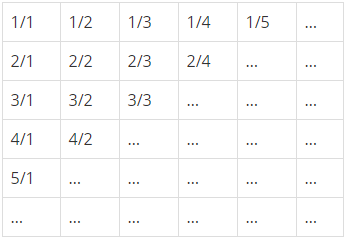 - 나열된 분수들을 1/1->1/2->2/1->3/1->2/2->... 과 같은 지그재그 순서로 차례대로 1번, 2번, 3번, 4번, 5번, ... 분수라고 한다.